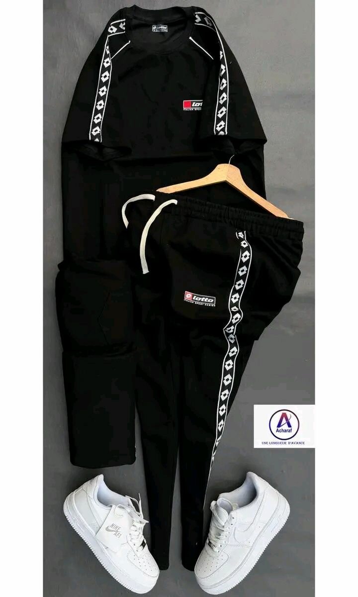 Ensemble survêtement noir avec motifs blancs et baskets blanches. Confort et style pour une tenue sportswear idéale.