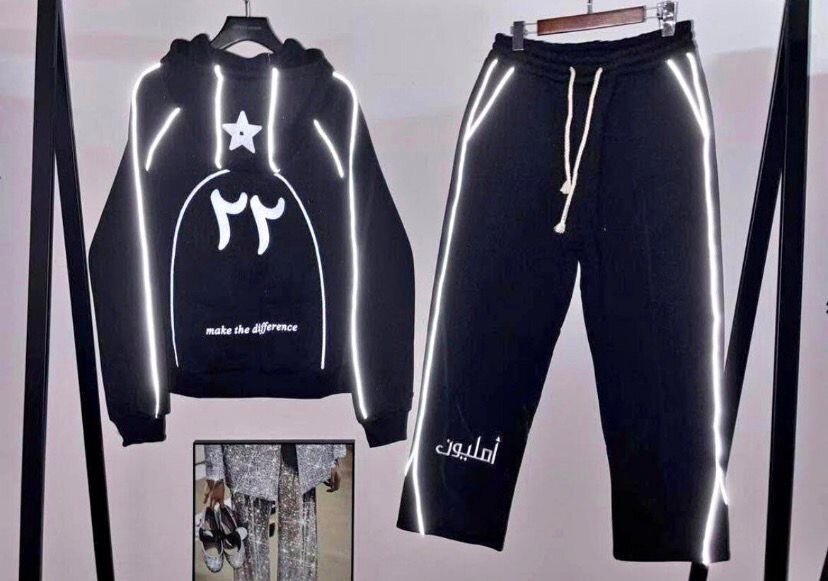 Survêtement tendance et confortable pour homme, disponible en noir, bleu et gris. Parfait pour le sport ou les sorties décontractées. Design moderne avec détails en arabe.