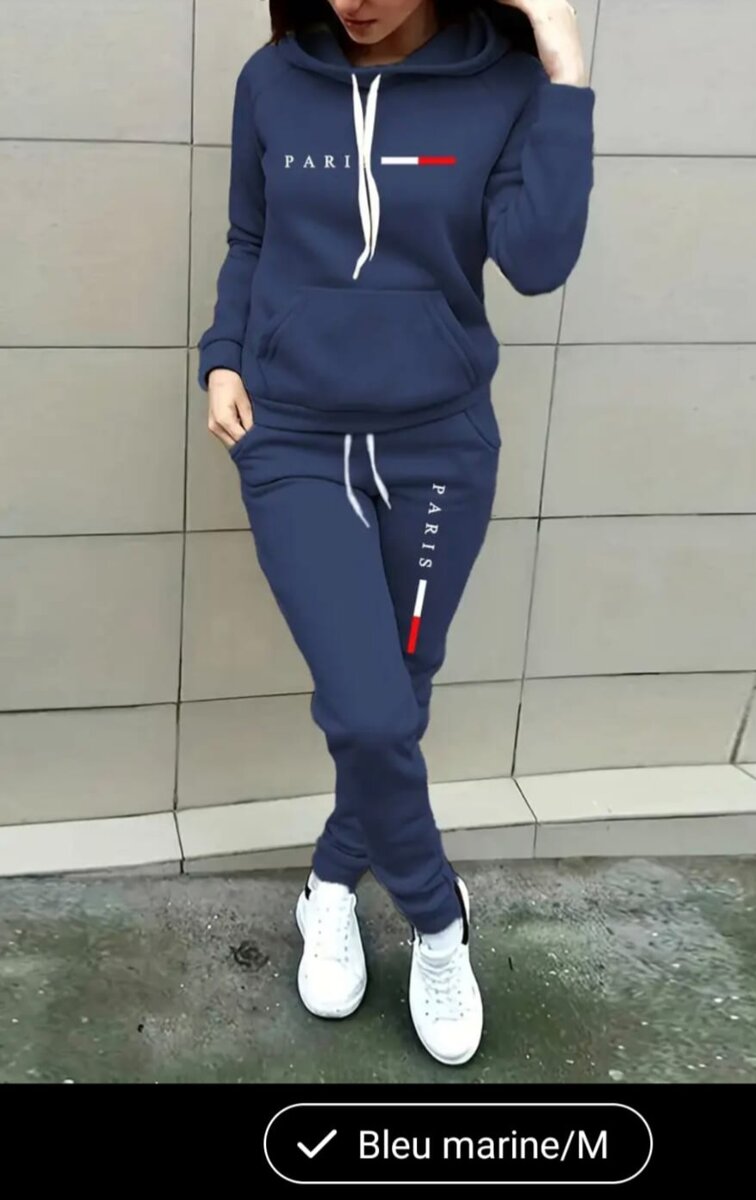 Ensemble survêtement pour femme, confortable et tendance, idéal pour le quotidien ou le sport. Fabriqué en matériau doux et respirant. Couleur bleu marine, taille M. Parfait pour un look décontracté et stylé.