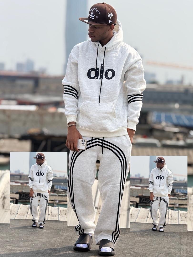 Survêtement homme blanc avec des bandes noires. Confortable et élégant, idéal pour le sport ou les activités décontractées. Conçu pour les hommes actifs.