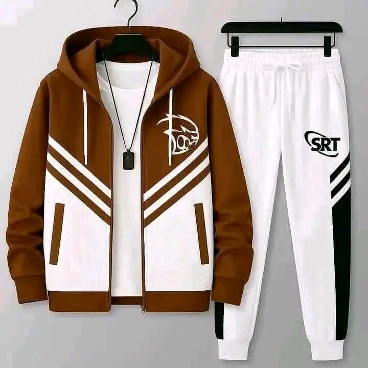 Ensemble survêtement pour homme de couleur marron et blanc, comprenant une veste zippée avec capuche et un pantalon de jogging. Conçu pour le confort et le style, cet ensemble est idéal pour les activités sportives ou pour une tenue décontractée.