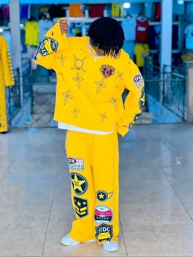 Survêtement pour garçon, jaune, avec motifs et logos sur les manches et les jambes. Idéal pour les activités décontractées ou sportives. Confortable et tendance.