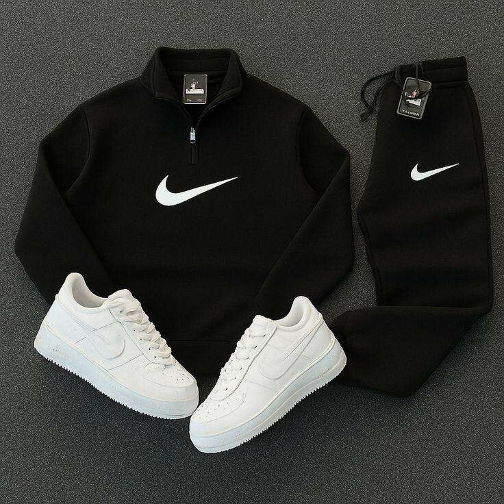 Découvrez cet ensemble survêtement Nike comprenant un pull noir avec logo blanc et un pantalon assorti. Parfait pour le sport ou le quotidien. Confortable et élégant, il est idéal pour les amateurs de mode sportive. Associé à des baskets blanches Nike Air Force.