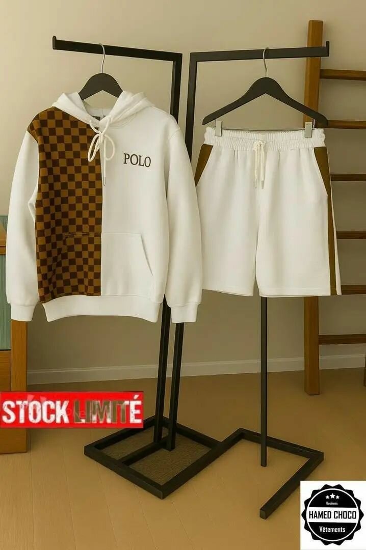 Ensemble survêtement pour homme en coton, composé d'un sweat à capuche et d'un short. Style décontracté et confortable.