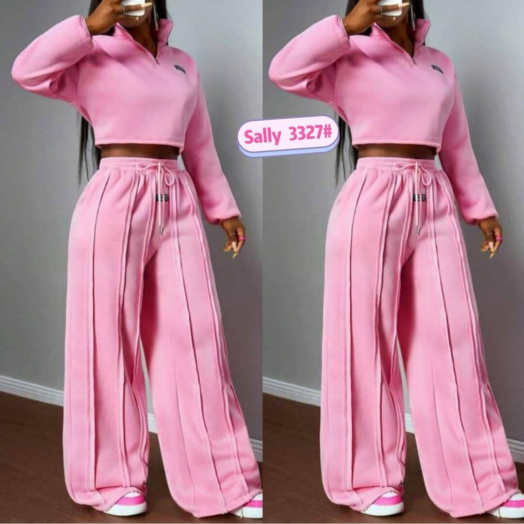 Ensemble survêtement rose pour femme, comprenant un haut courté et un pantalon large. Confectionné en matière douce et confortable. Idéal pour les activités décontractées ou le sportwear.