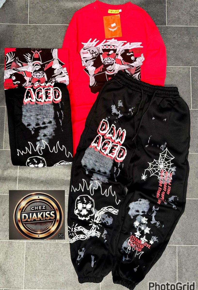 Survêtement tendance pour hommes avec des motifs uniques. Conçu pour les amateurs de mode streetwear. Comprend un haut rouge et des pantalons noirs assortis avec des designs originaux.