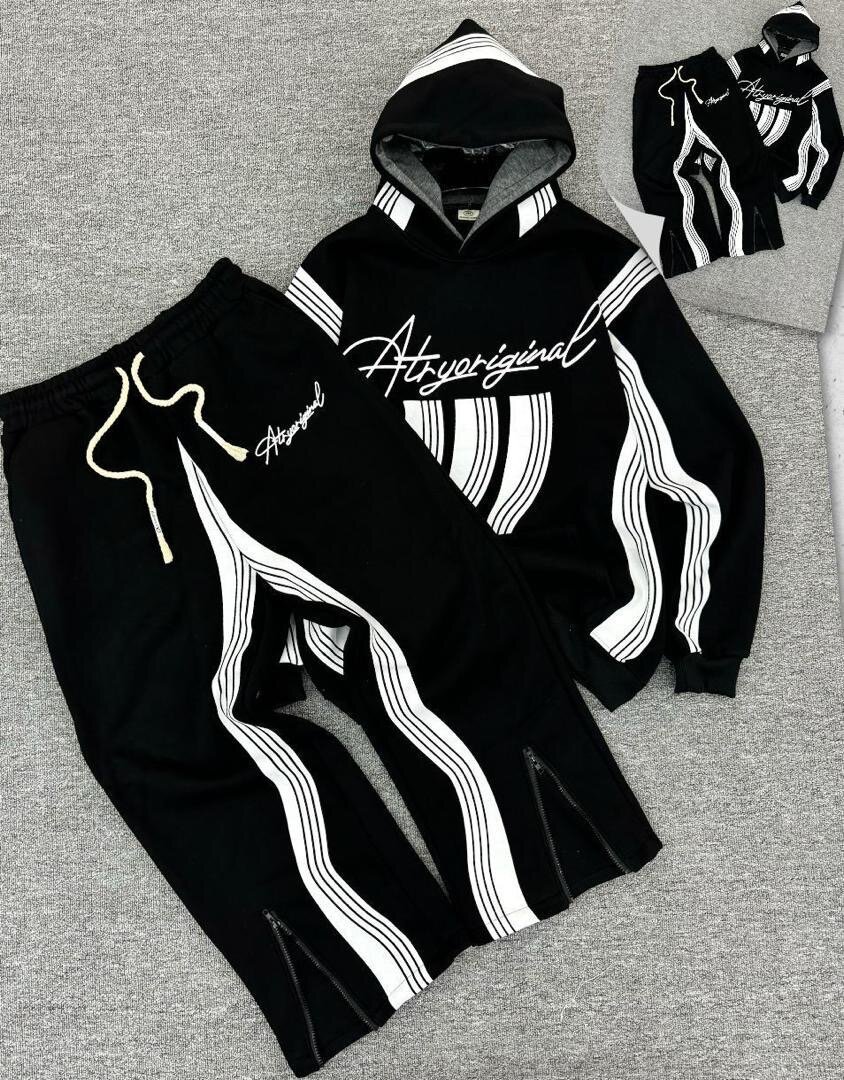 Explorez le confort et le style avec cet ensemble survêtement noir et blanc. Conçu pour un look décontracté, il se compose d'un hoodie et d'un pantalon à cordon. Idéal pour le sport ou la détente.