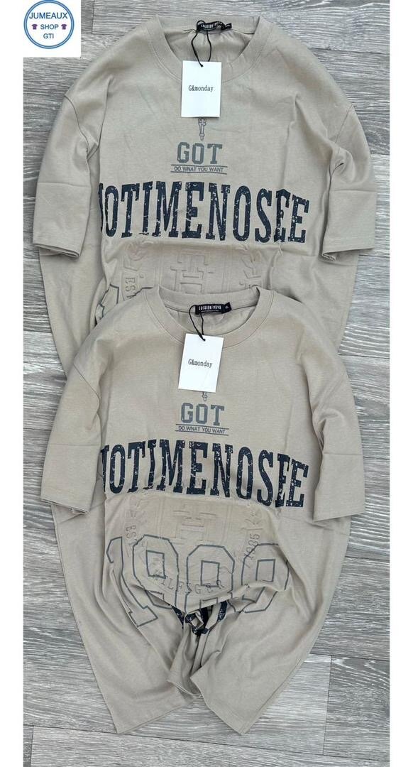 Ensemble pour enfant composé d'un sweat et d'un pantalon, imprimé 'Got Notimeno See'. Confortable et décontracté, parfait pour le quotidien. Disponible en beige.