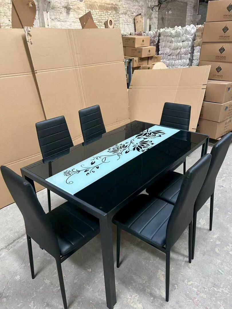 Optez pour cet élégant ensemble table et chaises au design moderne. Idéal pour embellir votre salle à manger ou votre cuisine, il se compose d'une table en verre au motif artistique et de six chaises confortables. Parfait pour les réunions de famille et les dîners entre amis. Durable et facile à entretenir.