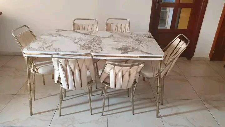 Découvrez cet ensemble élégant comprenant une table en marbre et six chaises confortables. Idéal pour sublimer votre salle à manger avec une touche contemporaine. Parfait pour les repas en famille ou entre amis.