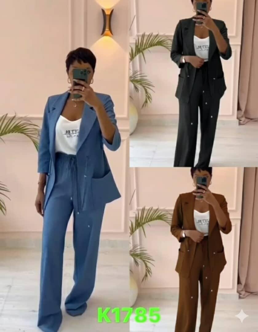 Optez pour cet ensemble tailleur 3 pièces moderne et polyvalent. Parfait pour le bureau ou des occasions formelles, comprenant un blazer et un pantalon ample pour un confort optimal. Disponible en plusieurs couleurs tendance. Un incontournable pour toute garde-robe professionnelle!