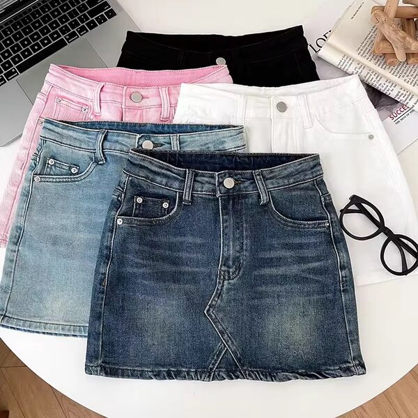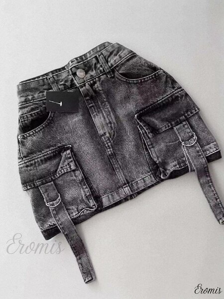 Ensemble moderne et stylé avec un top blanc et une jupe en jean gris de marque MOLI. Idéal pour un look décontracté et tendance.