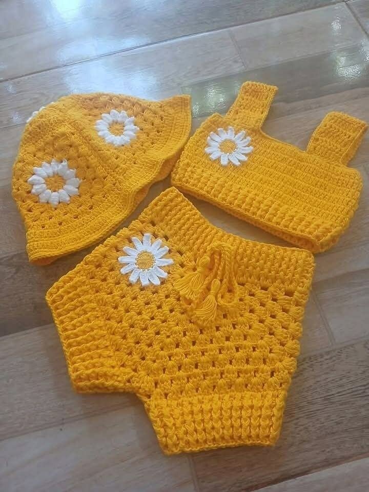 Cet ensemble tricoté pour bébé en couleurs solaires est idéal pour un look estival adorable. Composé d'un haut, d'un short et d'un chapeau, chaque pièce est ornée de motifs floraux. Confortable et respirant, il est parfait pour les journées chaudes. Offrez à votre bébé un look chaleureux et lumineux avec cet ensemble unique!