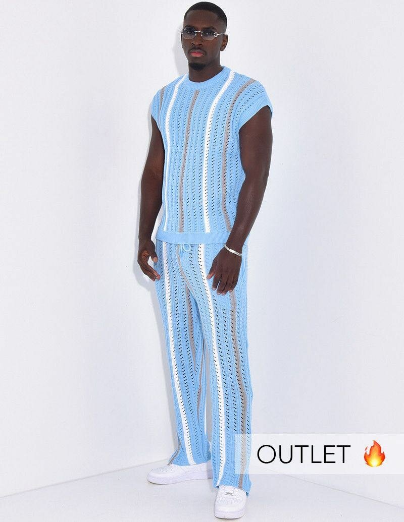 Adoptez ce style unique avec notre ensemble tricoté bleu pour homme. Confortable et tendance, il est idéal pour une tenue décontractée ou une sortie estivale. Fabriqué dans un matériau léger, cet ensemble vous assure à la fois confort et style sophistiqué.