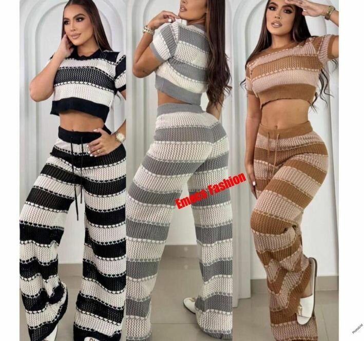Ensemble deux pièces en tricot rayé pour femme. Confortable et élégant, parfait pour les sorties décontractées. Disponible en plusieurs coloris.