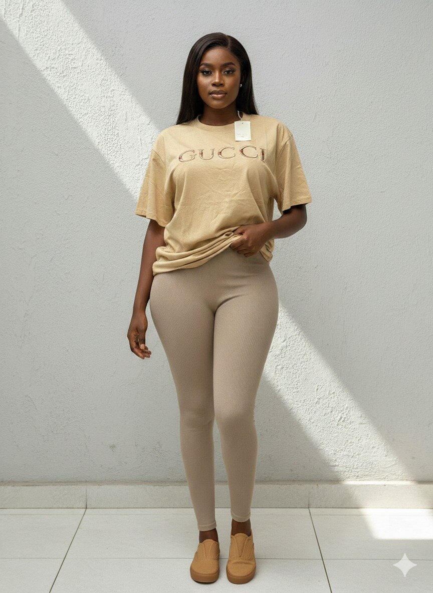 Embrace luxury with this Gucci beige t-shirt. Its soft fabric and relaxed fit make it perfect for casual outings. Pair it with jeans or leggings for a chic, comfortable look. A must-have staple for a fashion-forward wardrobe.