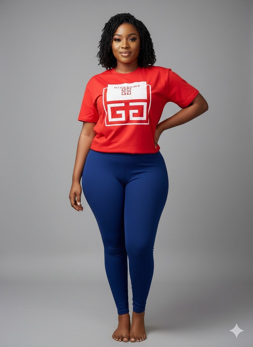 Upgrade your casual wardrobe with this trendy red tee and blue leggings set. Perfect for lounging at home or stepping out for errands, the vibrant colors and comfortable fit make it a versatile choice. The set is easy to mix and match, offering endless styling options. Ideal for fashion-forward individuals seeking both comfort and style. Don't miss out on this must-have ensemble!