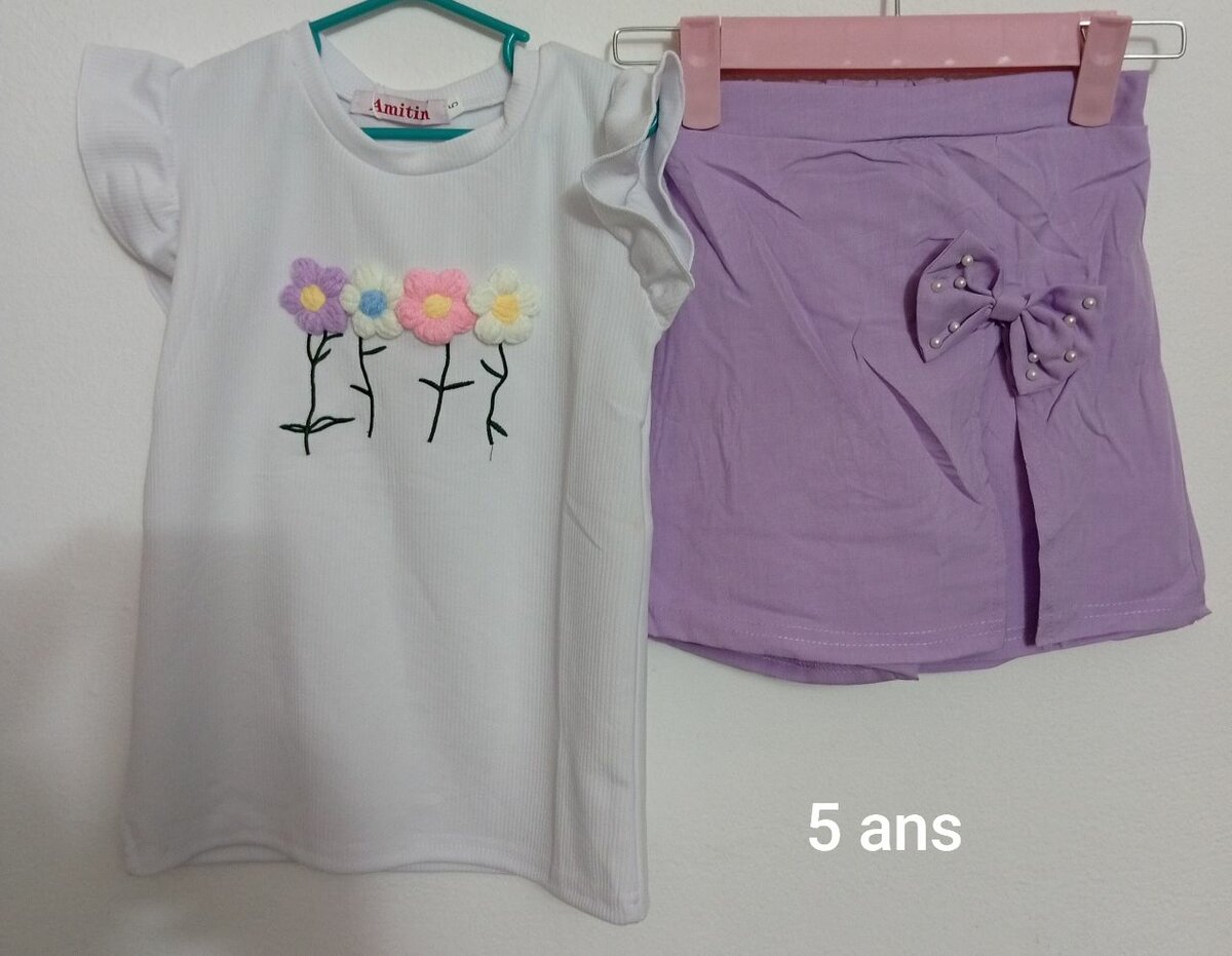Adorable ensemble pour fille avec T-shirt à motif floral et jupe violette nouée. Confortable, idéal pour l'été et les occasions spéciales. Convient aux filles de 5 ans.