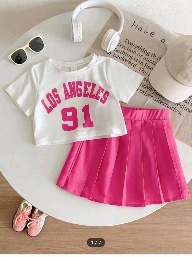 Adorable ensemble pour filles avec un T-shirt imprmé et une jupe plissée rose. Parfait pour un look urbain et branché.
