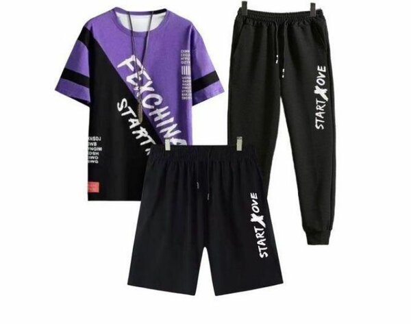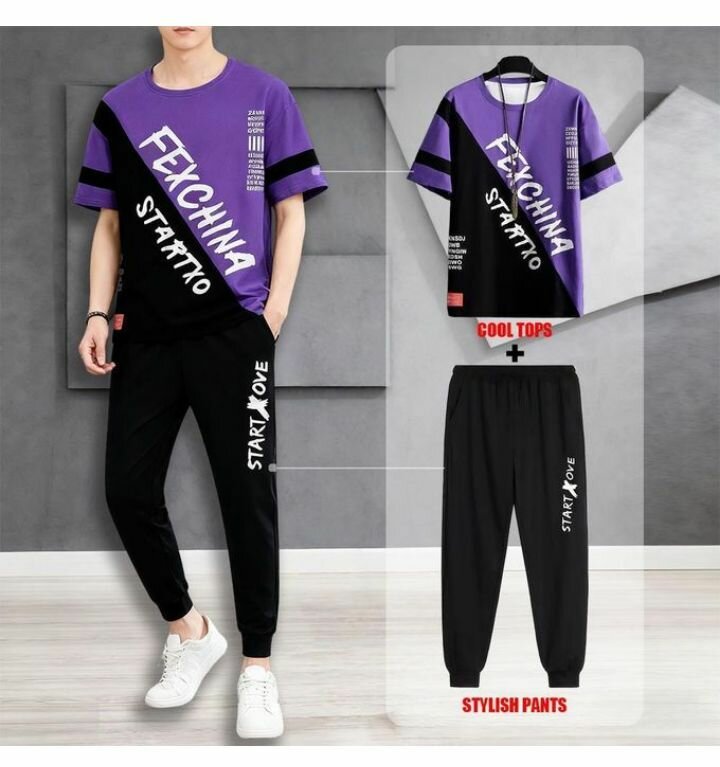 Optez pour cet ensemble tendance avec un T-shirt violet imprimé et pantalon noir. Parfait pour un look urbain et confortable. Idéal pour les sorties décontractées ou le sport.