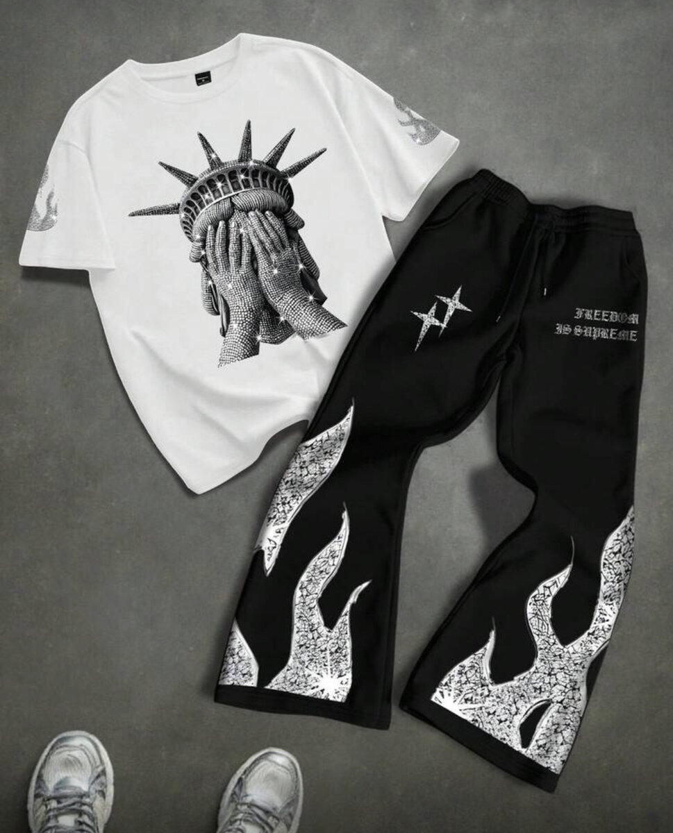 Exprimez votre style unique avec cet ensemble branché comprenant un t-shirt à imprimé Statue de la Liberté et un pantalon à motifs flammes. Parfait pour un look audacieux et original. Disponible en différentes tailles. Idéal pour les sorties décontractées ou les moments de détente en ville!