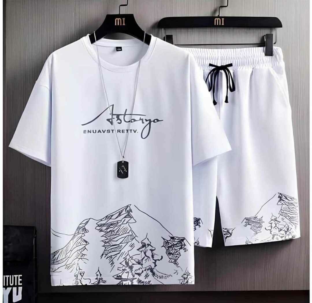 Ensemble décontracté en coton avec motif montagne. Parfait pour un look estival relax. T-shirt ample et short à cordon pour un confort optimal.