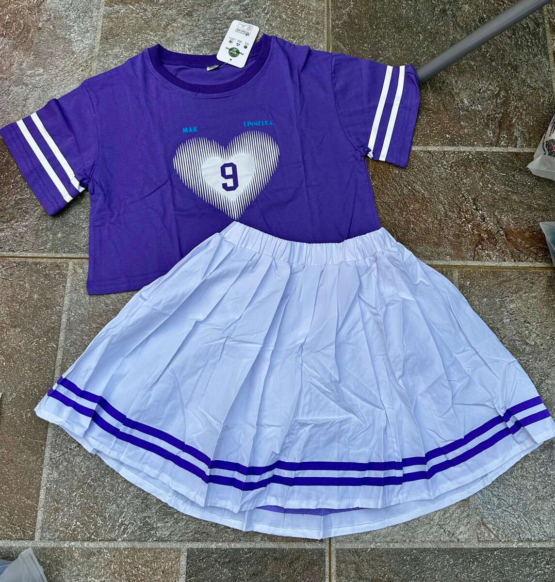 Optez pour cet ensemble tendance pour enfants avec un T-shirt violet à motif et une jupe légère blanche. Idéal pour une tenue quotidienne stylée.