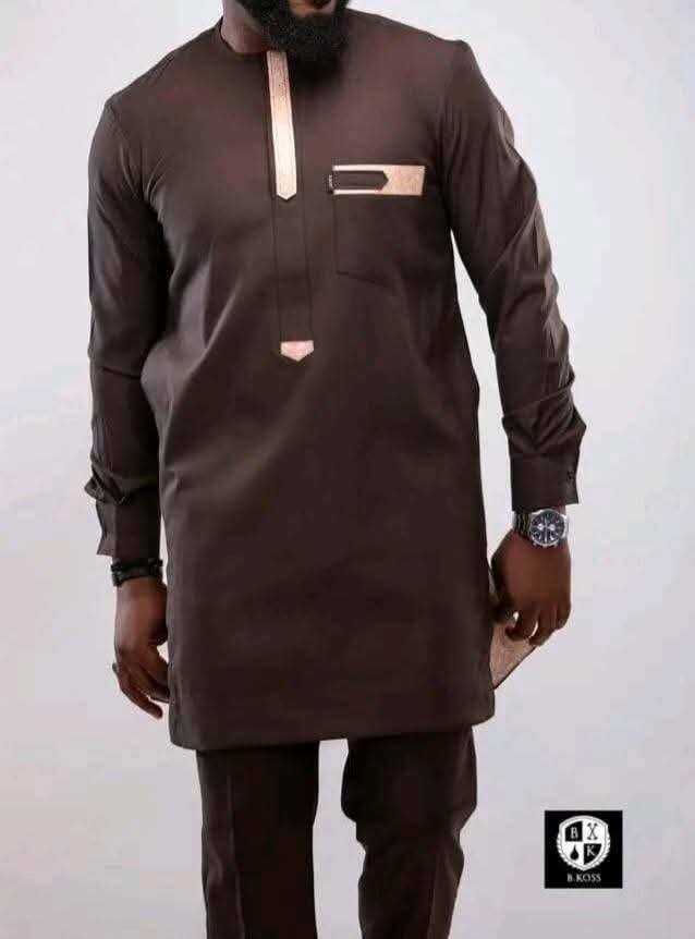 Ensemble Tunique Homme Manches Longues de couleur Marron. Fait en coton, propre et pratique pour vos différentes cérémonies et prestations. Disponible en taille : L, XL et XXL