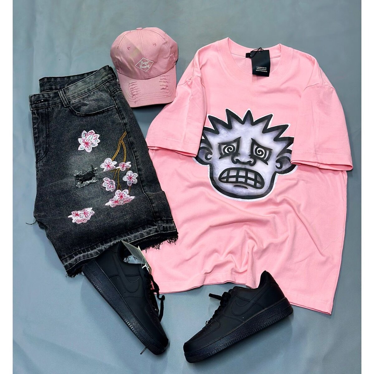 Optez pour un style audacieux avec cet ensemble urbain comprenant un t-shirt graphique rose, un short en jean noir avec broderies florales, et des baskets noires. Idéal pour un look tendance et confortable en ville. Complétez avec la casquette assortie pour un style streetwear parfait.