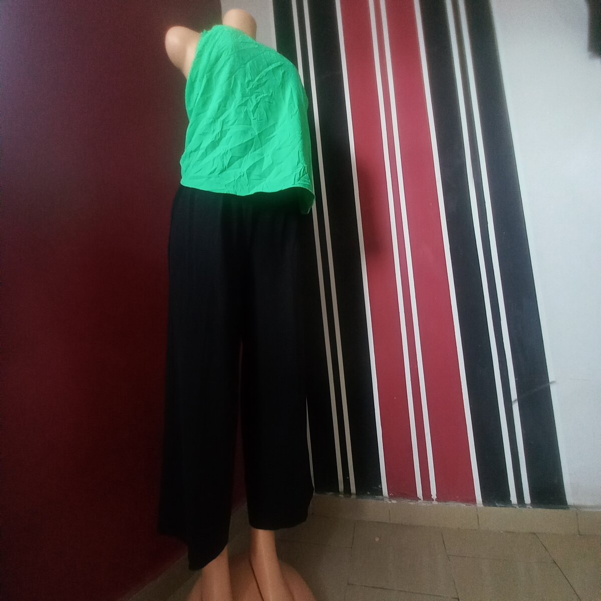 Découvrez notre ensemble élégant composé d'un haut vert vif et d'un pantalon noir fluide. Parfait pour une tenue chic et confortable, il convient à toutes les occasions. Idéal pour les sorties estivales ou une journée au bureau avec style. Faites tourner les têtes avec cet ensemble moderne!