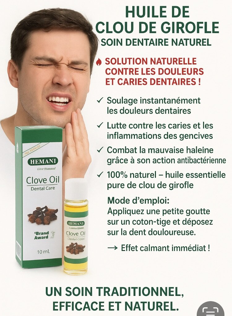 L'Huile de Clou de Girofle Hemani offre un soin dentaire naturel pour soulager les douleurs dentaires instantanément. Combat les caries et la mauvaise haleine grâce à ses propriétés antibactériennes. Idéale pour une utilisation quotidienne. Appliquez une goutte pour un effet calmant immédiat.