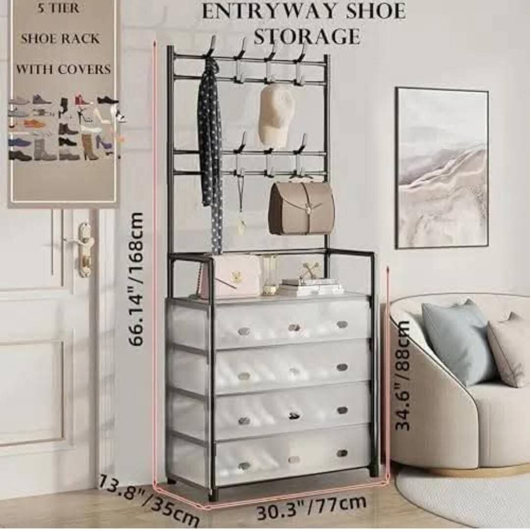 Optimisez votre espace avec cette étagère à chaussures polyvalente. Avec cinq niveaux et des couvre-chaussures, elle inclut un rangement suspendu parfait pour sacs et accessoires. Compacte et élégante, elle est idéale pour d'entrée ou couloir.