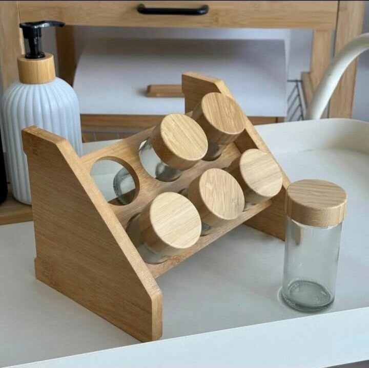Optimisez votre cuisine avec cette élégante étagère à épices en bois. Comprend 6 bocaux en verre avec couvercles en bois, parfaits pour organiser vos épices avec style. Idéale pour les amateurs de cuisine soucieux du design et de la fonctionnalité.