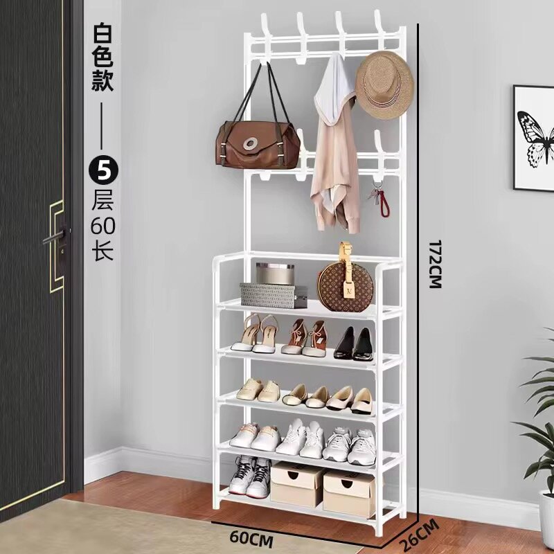 Organisez votre espace avec cette élégante étagère porte-manteau blanche. Parfaite pour les entrées, elle dispose de cinq étagères pour chaussures et de crochets supérieurs pour sacs et chapeaux. Idéale pour garder votre maison bien rangée et stylée.