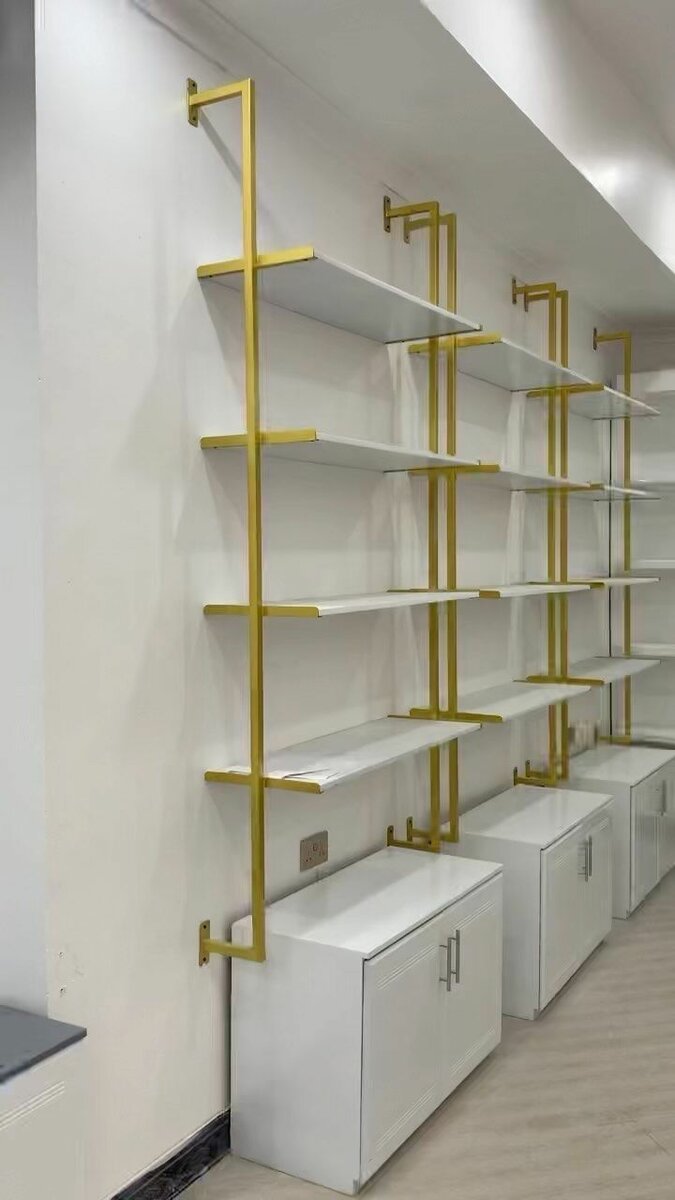 Étagères murales modernes avec supports dorés et tablettes blanches. Parfaites pour organiser votre espace de vie ou de travail avec style. Robustes et faciles à installer, elles s'intègrent parfaitement dans tout décor.