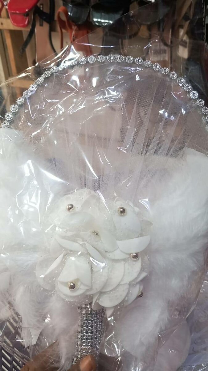 Élégant éventail de mariage orné de fleurs blanches et plumes, parfait pour une touche glamour lors de votre cérémonie.