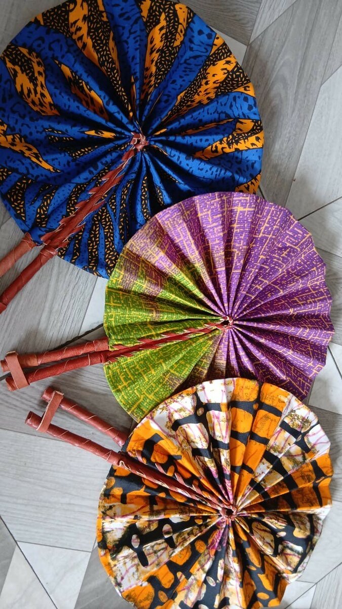 Confectionné à la main, cet éventail combine avec finesse les tissus africains wax colorés et le cuir de qualité