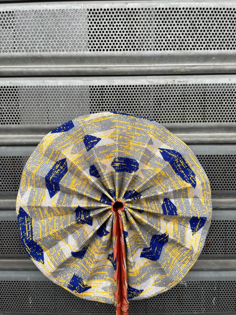 Éventail pliable en tissu multicolore vibrant. Idéal pour rafraîchir les journées chaudes, il ajoute une touche d'élégance et de culture à vos accessoires. Parfait pour des événements extérieurs ou comme cadeau unique.