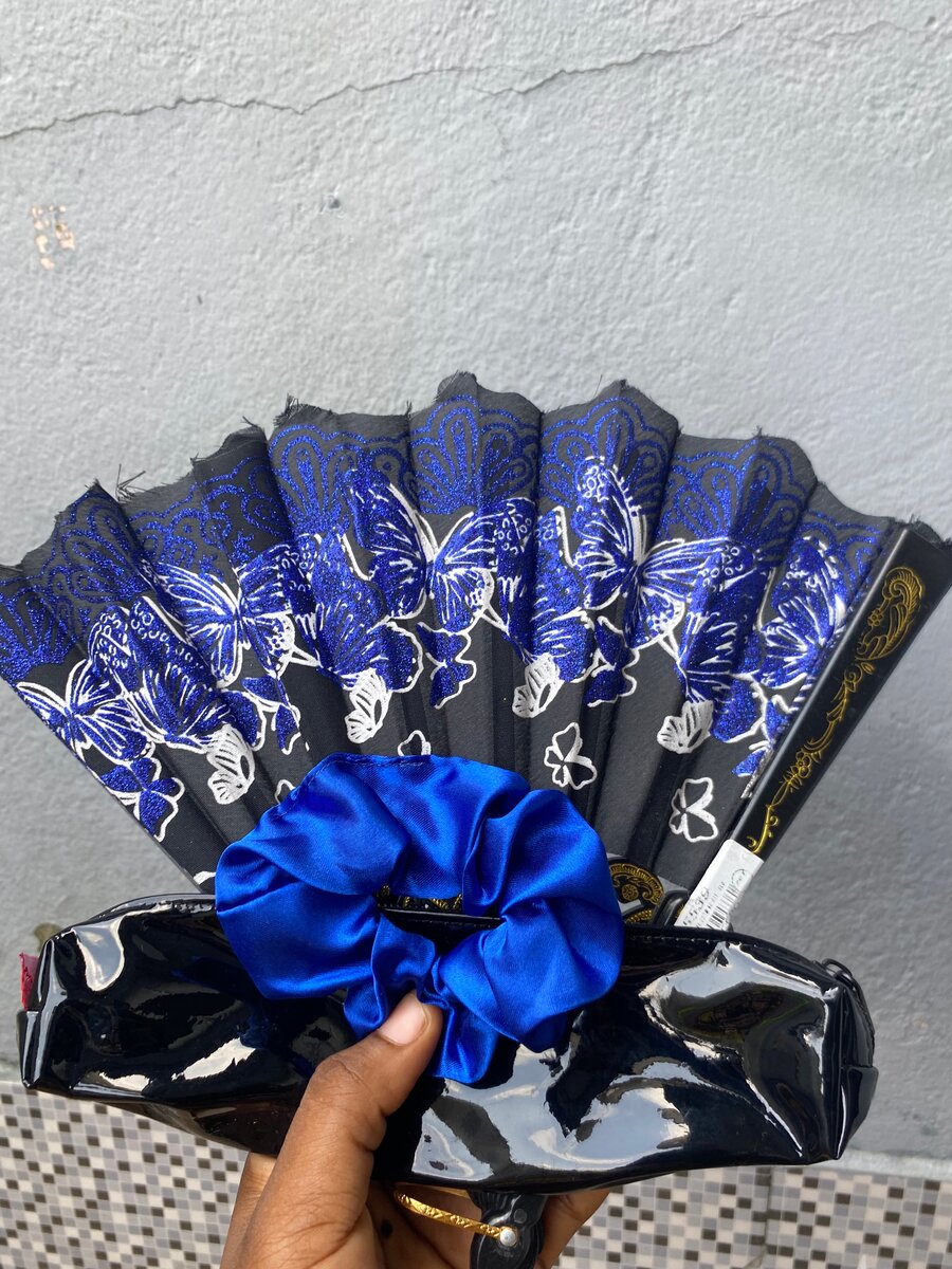 Découvrez cet éventail pliant élégant orné de motifs papillon et aux nuances bleues et noires. Parfait pour ajouter une touche raffinée à votre tenue lors d'une sortie estivale ou d'un événement spécial.