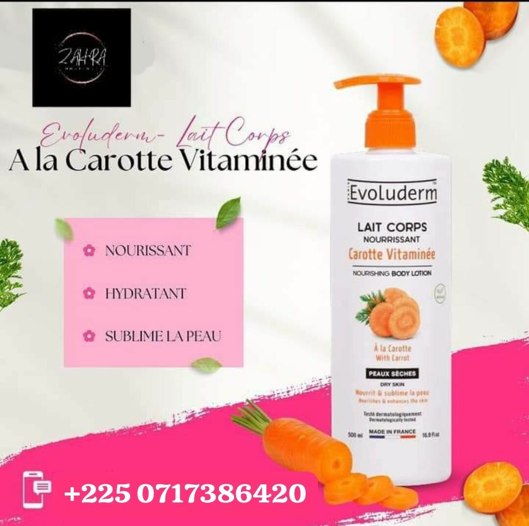 ARRIVAGE, DÉSORMAIS DISPONIBLE EVOLUDERM CAROTTE VITAMINÉE NOURRIT SUBLIME LA PEAU HYDRATANT Provenance France Vente en CÔTE D'IVOIRE PRIX: 6000 fr, L'unité CONTENANCE : 500 ml NB: LIVRAISON À VOS FRAIS