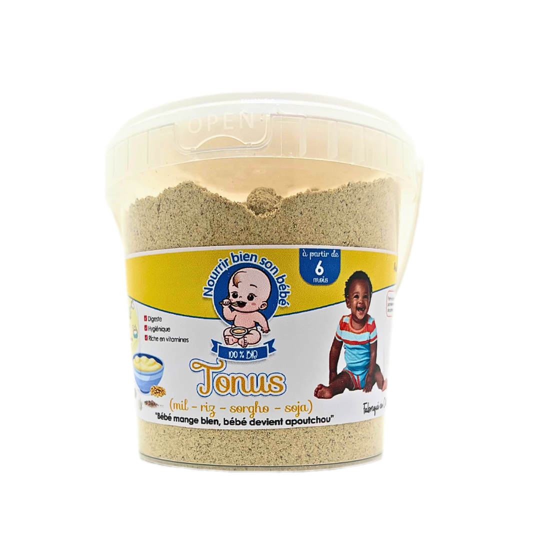 Farine nourrissante Jonus pour bébés dès 6 mois. Mélange de mil, riz, sorgho et soja, riche en vitamines et minéraux essentiels. Idéal pour favoriser la croissance saine de votre enfant. Préparez de délicieuses bouillies pour un bébé heureux et bien nourri.