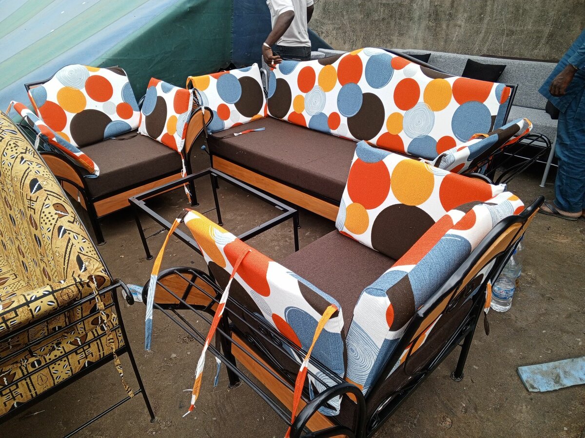 Salon en fer forgé de cinq places composé en divan de trois places , de deux fauteuils d'une place chacun et d'une table basse