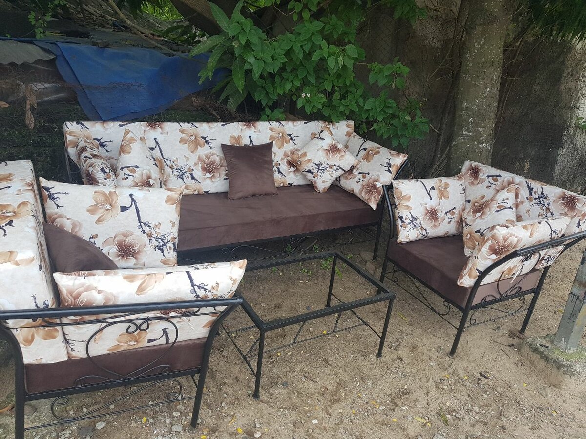 Salon en fer forgé de cinq places composé en divan de trois places , de deux fauteuils d'une place chacun et d'une table basse