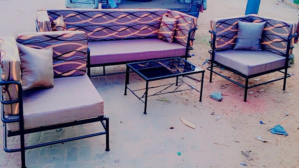 Salon en fer forgé de cinq places composé en divan de trois places , de deux fauteuils d'une place chacun et d'une table basse
