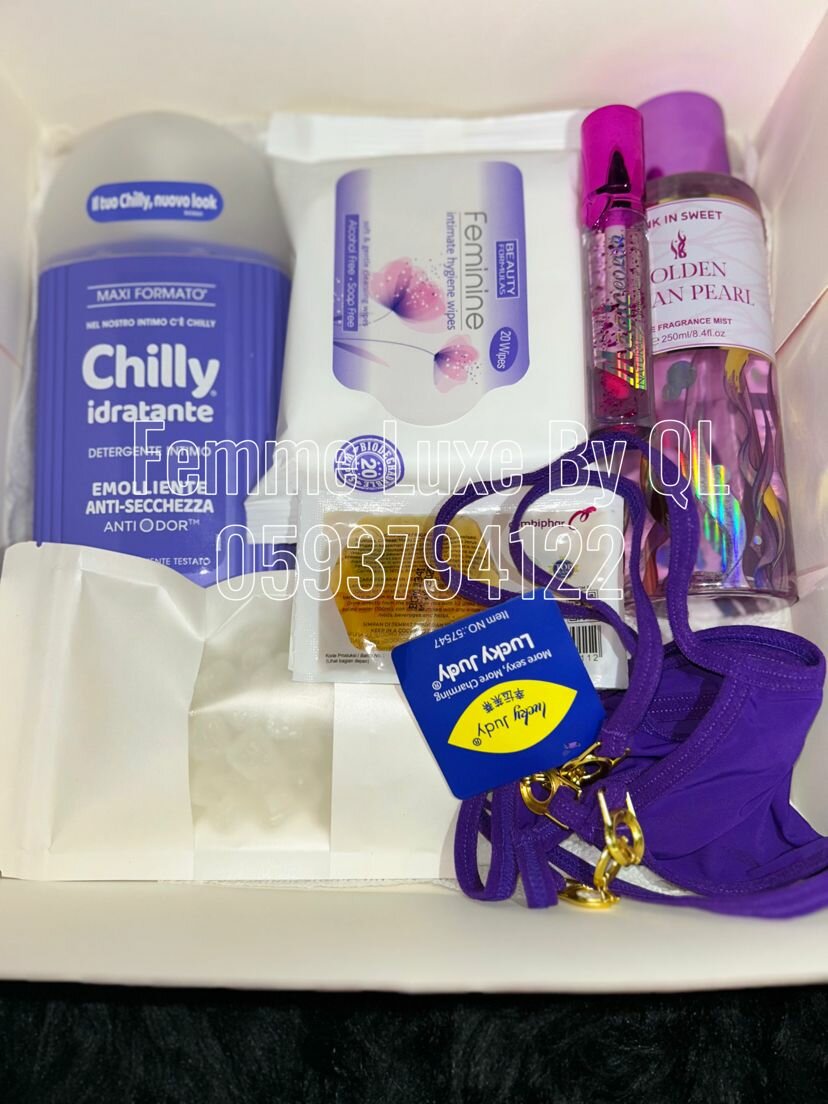 A girly box specially designed for ladies and it comes with a feminine wash,feminine wipe,lipgloss,bodysplash,a panty and xxx swetner.