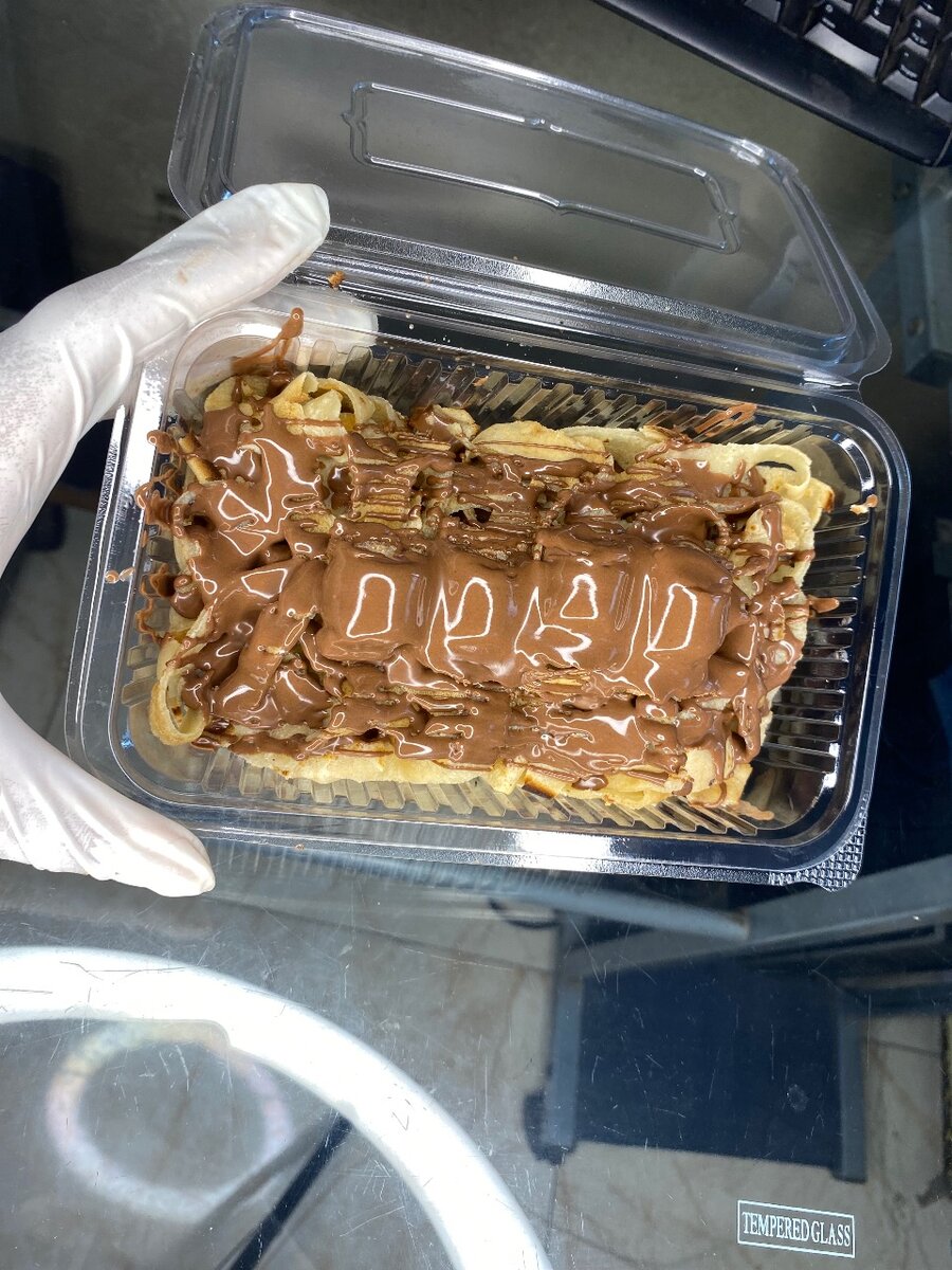 Dégustez notre délicieuse gaufre nappée de chocolat fondant. Parfait pour les amateurs de chocolat, cette gourmandise croustillante à l'extérieur et moelleuse à l'intérieur est idéale pour une pause sucrée. Savourez-la à tout moment de la journée!