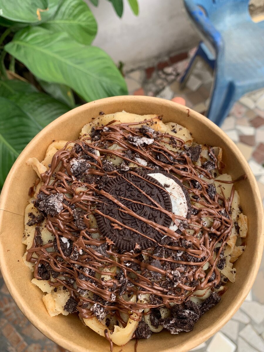 Découvrez notre grand bol de 10 crêpes fettuccine garnie de chocolat fondant nutella et d'un savoureux biscuit Oreo.