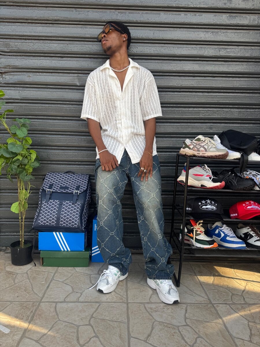 Jean en denim avec motifs imprimés Style : Streetwear chic. Détails : Motif répété avec une touche de luxe. Coupe droite, parfaite pour un look moderne et tendance.