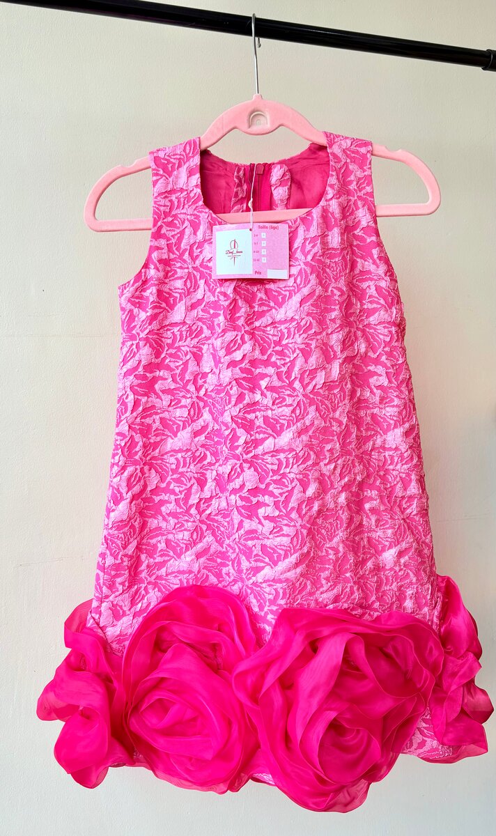 Delight in the charm of this floral pink dress, perfect for little girls. Adorned with playful rosettes at the hem, it's ideal for parties and special occasions. Crafted from soft, breathable fabric for comfort and style.