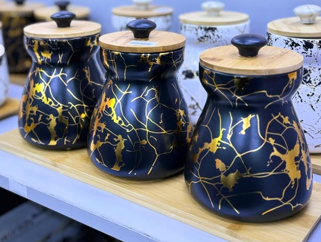 из трех керамических банок, бамбуковых крышек и бамбуковая подставка которая не боится воды 👌